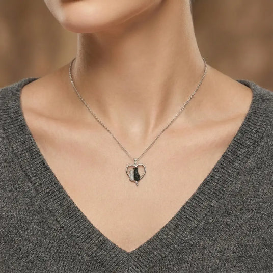 Ce collier pendentif chat noir en ton argenté met en scène deux chats stylisés, l’un noir et l’autre blanc, lovés dans un cœur pour symboliser la complicité et l’amour. Les pierres scintillantes qui soulignent le contour apportent une jolie brillance au décolleté tout en restant délicates. Idéal pour les amoureuses des félins, ce bijou romantique et raffiné se porte aussi bien au quotidien que pour une occasion spéciale.